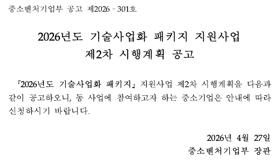[중기부] 2026년도 기술사업화 패키지 지원사업 제2차 시행계획 공고